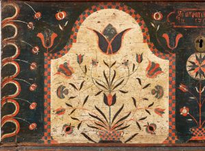 This exceptional chest retains its original decoration, featuring vibrant potted tulips on ivory panels with a rich blue surround and distinctive heart corners. Measuring 24″ high by 47 1/2″ wide, it carries an impressive provenance that includes the Philadelphia Museum of Art; Ronald Pook Antiques; a private Pennsylvania collection; Olde Hope Antiques; David A. Schorsch (1996); and the Collection of the late Grant H. Griswold.